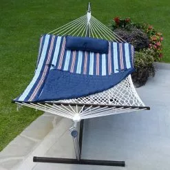 The all-in-one natural cotton rope hammock is designed at heart to soothe the rattled body of modern life. It does so with a 52″W x 76″L hand-woven hammock bed that is constructed of all natural cotton rope that gently shapes to the body’s natural curvature. The no-tool assembly hammock stand is made of rust-resistent powder coated tubular steel which includes mar resistent plastic feet. A stylish quilted hammock pad and matching head pillow further enhance the soothing experience. Designed for one person, this hammock will help enable the solitude you are seeking, if only for a few restful minutes or hours.