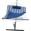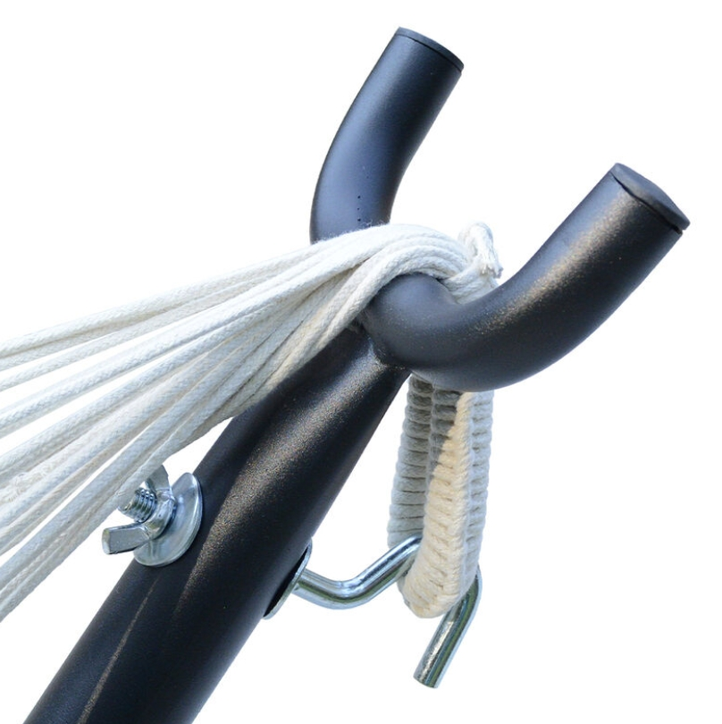 The Algoma Portable Hammock and Stand is a great selection for backyard, patio, camping, the beach, or any other place a hammock is desired. The hammock bed is made of weather-resistant polyester fabric with cotton rope ends to hang from the powder-coated steel hammock stand. Adjustment hooks allow the user to place the hammock at the perfect height. Everything breaks down easily and can be stored and carried in the included polyester bag with carry straps.