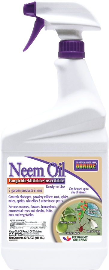 An all purpose insecticide, miticide, fungicide for organic gardening. Derived from the Neem seed. Use on roses, flowers, vegetables, herbs, spices, houseplants, trees, turf and shrubs. Kills all stages of insects – eggs, larvae and adults. Makes a great dormant spray.