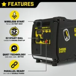Champion’s got convenience covered. Starting and stopping your generator from up to 80 feet away with the wireless remote key fob is a snap. Champion’s EZ Start Dial makes getting started quick and easy. Featuring Cold Start Technology, Extended Run Time, and an easy to read fuel gauge, the reliable 212cc Champion engine produces 4500 starting watts and 3500 running watts, and runs for 14 hours at 25% load when the 2.3-gallon fuel tank is full.