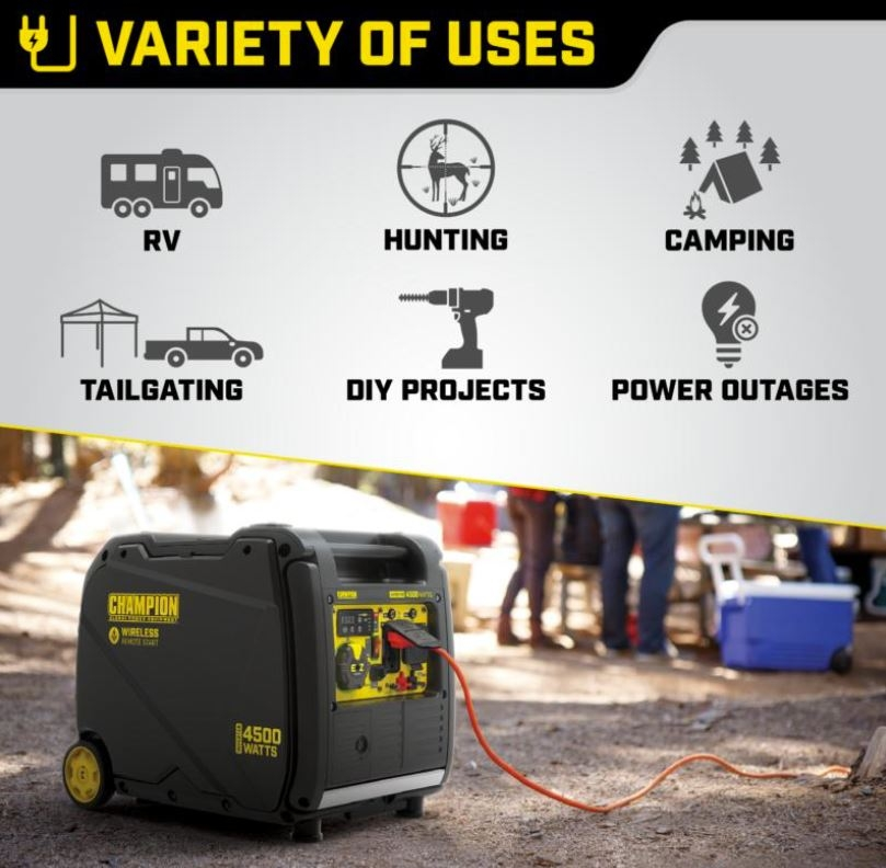 The Champion Power Equipment 4500-Watt Inverter Generator is ultra-quiet and ideal for camping, tailgating, powering items around the RV or providing backup for your essentials.