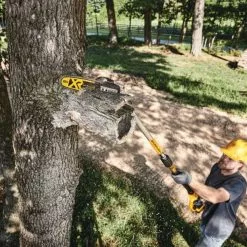The DEWALT 20V MAX* XR Brushless Cordless Pole Saw comes equipped with an 8 in. Bar and Chain to handle all of your pruning needs. It features a high efficiency brushless motor that delivers up to 96 cuts per charge. The well balanced design and durable pole shaft extends up to 10 ft. for a total reach of 15 ft. It has an auto oiling feature for added convenience and time saving. It also features metal bucking strips for a durable cutting grip and a tree hook allows you to easily remove pruned branches.