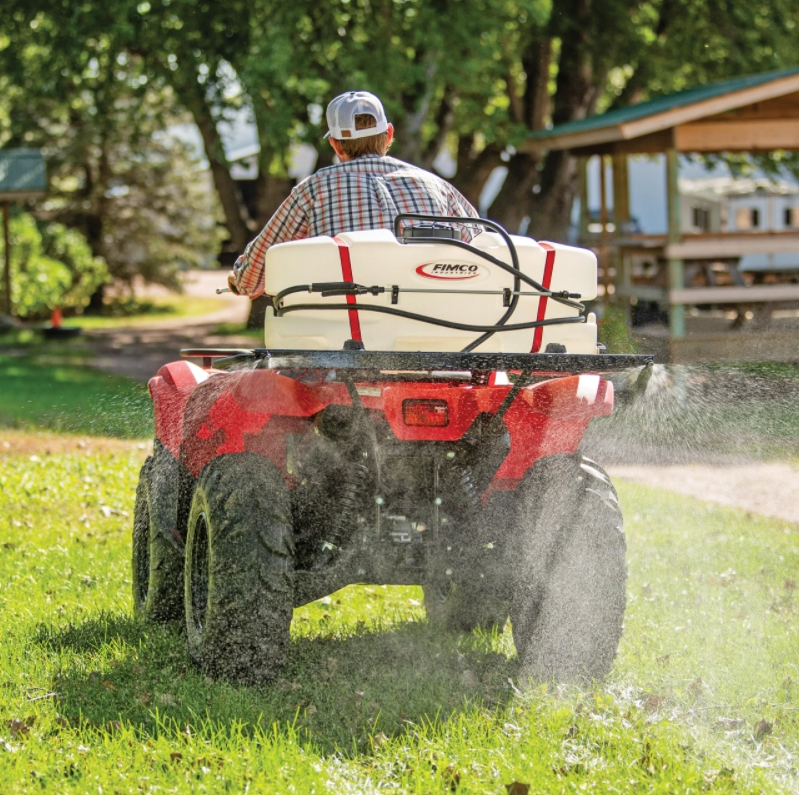 The FIMCO 20 Gallon ATV Sprayer is our basic 2 Nozzle spraying boom offering the versatility and efficiency needed to spray tight spaces or larger areas. The UV resistant, molded polymer tank has a 5 inch tethered lid for easy access and is completely drainable. Convert from a Spot to ATV sprayer with the quick release mounting bracket, allowing for simple installation or removal of the spray boom. This model features the High Flo High Performance 2.4 GPM Pump. The Lever Handgun distributes 30 up to feet of horizontal spray, 16 feet of vertical spray and comes with 15 feet of 3/8 inch hose. The 2 Nozzle boom offers 7 feet of total spray coverage and our FIMCO exclusive manifold places pressure control and boom operation at your fingertips to conveniently fine tune your spray pattern. This sprayer is ideal for small pastures and rural properties.