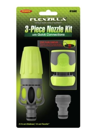 The convenient Flexzilla® 3-Piece Nozzle Kit with Quick Connections comes complete with quick connect spray nozzle, flow-stop coupler quick connect attachment adaptor which makes gardening a snap.