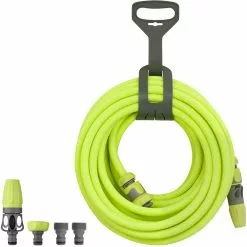 The Flexzilla® Garden Hose Kit with Quick Connect Attachments features Flexible Hybrid Polymer material with extreme all-weather flexibility that allows hose to lie flat and won’t kink under pressure. It’s lightweight and coils easily. The convenient Flexzilla Garden Hose Kit comes with hose, twist action nozzle, quick connect flow-stop coupler, spigot adapter, hose adapters and hose hanger to make gardening a snap.
