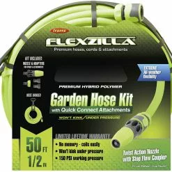 The Flexzilla® Garden Hose Kit with Quick Connect Attachments features Flexible Hybrid Polymer material with extreme all-weather flexibility that allows hose to lie flat and won’t kink under pressure. It’s lightweight and coils easily. The convenient Flexzilla Garden Hose Kit comes with hose, twist action nozzle, quick connect flow-stop coupler, spigot adapter, hose adapters and hose hanger to make gardening a snap.