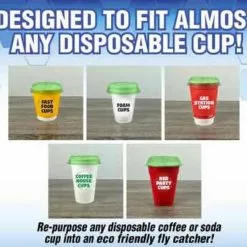 • ECO-FRIENDLY! The Fly Lid is made from recycled plastic and does not use harmful chemicals to lure flies. The Fly Lid can be popped onto a cup you already have around the house, or even a disposable cup you were going to throw away anyway! No need to buy large plastic fly traps or bags when a paper coffee cup paired with the Fly-Lid will catch thousands of flies!