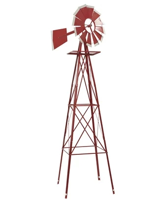 Does this ornamental windmill measure wind speed, or wind direction? Actually it splits the difference and covers both, all while adding a rustic touch to your yard. The windmill uses a fully operational rotating wheel to give you an idea of how hard the wind is blowing, plus a top weather vane to indicate the direction of the breeze. Standing 8ft. tall, the heavy steel structure utilizes sealed roller bearings with greased zerks to keep the 22in. dia. wheel turning quietly and effortlessly. A durable red powder-coat finish with white trimmed blades will keep this lawn favorite looking great for years to come. Includes anchor stakes.