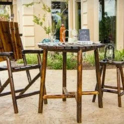 This chair is wide, with a tall back. Unlike a typical bar stool, this bar height chair proudly features arm rest for extra comfort. Each log is cut, charred, and polished. This curing process prevents mold and mildew, insect infestation, and adds fire resistance. The logs are pre-checked to prevent splitting from wood expansion and shrinkage. They are then sealed with a clear coat of varnish for a glossy finish.