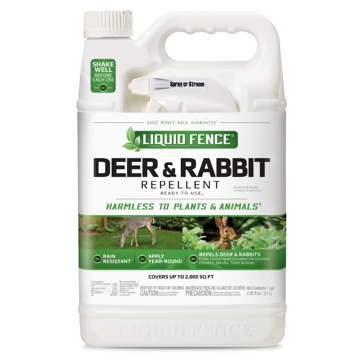 Don’t let animals have the pick of the garden before you can. Deer, rabbits, moles and other four-legged pests enjoy your lawn and landscape as much as you do – hit them in the nose so they won’t come back. Liquid Fence animal repellents use scent- and taste-deterring formulas that won’t harm animals or plants when used as directed. Invisible barrier. Clear results.Liquid Fence Deer and Rabbit Repellent Ready-to-Use2 repels deer and rabbits before they feed. This ready-to-use liquid formula repels deer and rabbits from landscaped ornamental gardens, flowers, shrubs, trees and vines. The repellent works on scent, so deer and rabbits don’t have to take a bite to be repelled. It is harmless to plants and animals when used and stored as directed, and can be applied year-round. The formula is rain resistant.Animals’ natural aversion to this scent will never diminish – this product does not have to be rotated with other repellent brands. Apply once during a dry period; repeat application a week later, then approximately once per month thereafter. In areas of intense feeding, spray once per week for 3 weeks, then once per month thereafter.