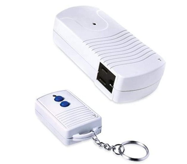 Master electrician, white, wireless indoor remote control, 2 grounded outlets, both outlets operate by remote control, 80′ range compact transmitter 12V, 23A, FCC approved, great for holiday decorations, 125VAC, 60 Hz, 1000W tungsten, 13A UL listed, includes A23 12V battery, for replacement battery, use TV #139-067 Energizer 23A, 12V battery.