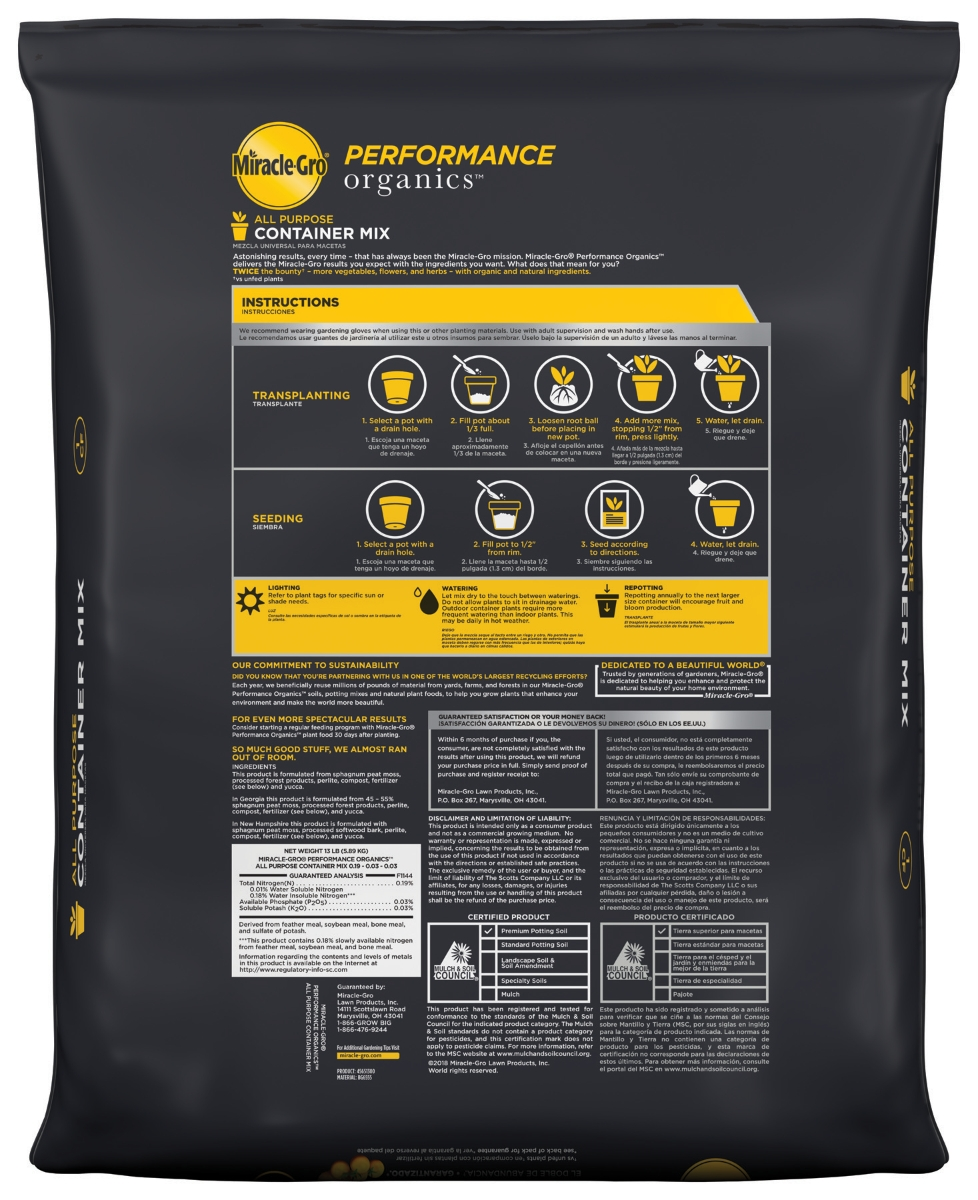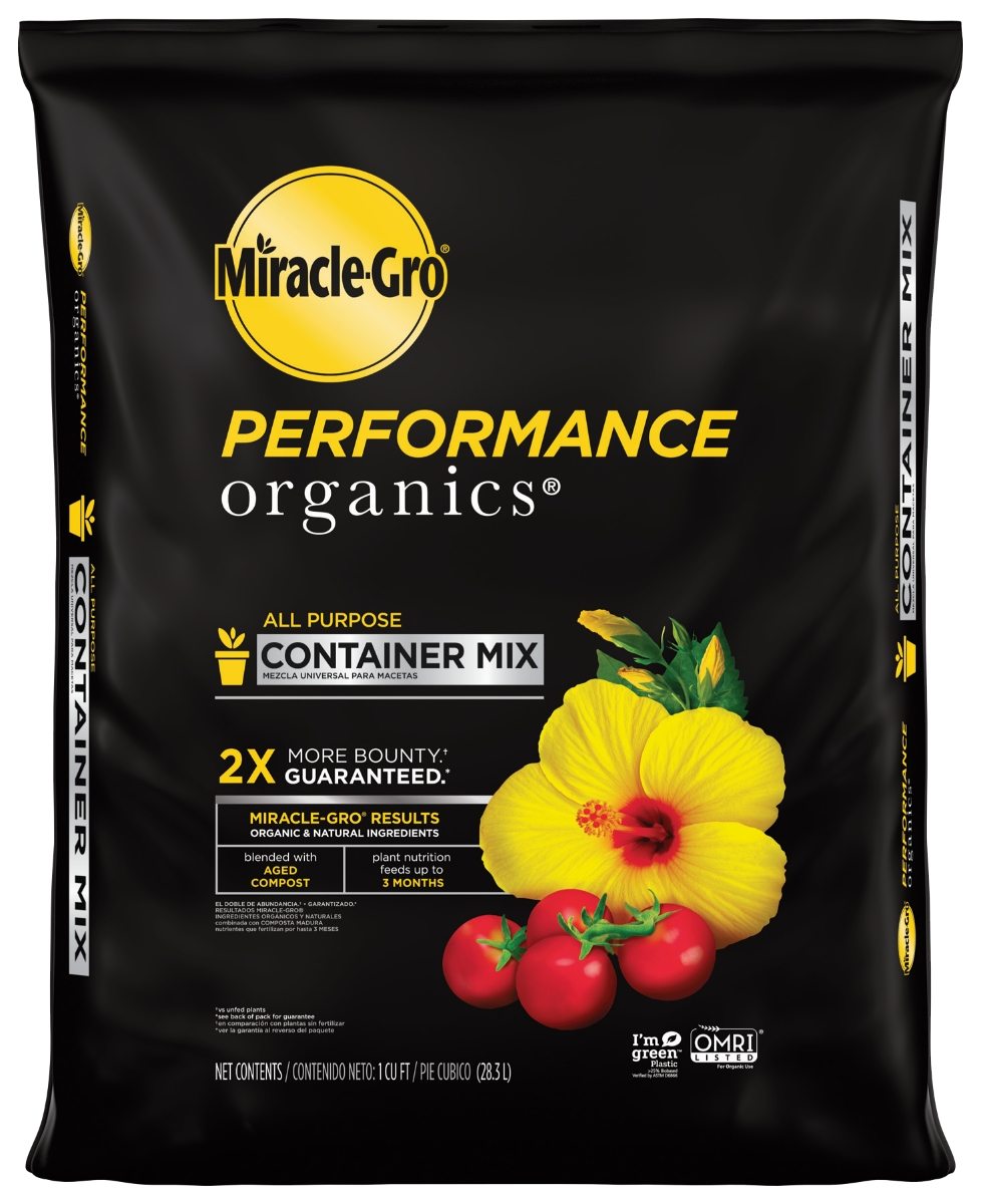 Astonishing results, every time—that has always been the Miracle-Gro mission. Miracle-Gro® Performance Organics™ All Purpose Container Mix delivers the Miracle-Gro results you expect with the ingredients you want. What does that mean for you? More bounty—vegetables, flowers, and herbs—organically. Season long plant nutrition and aged compost deliver up to 2x more bounty, guaranteed (vs. unfed plants).