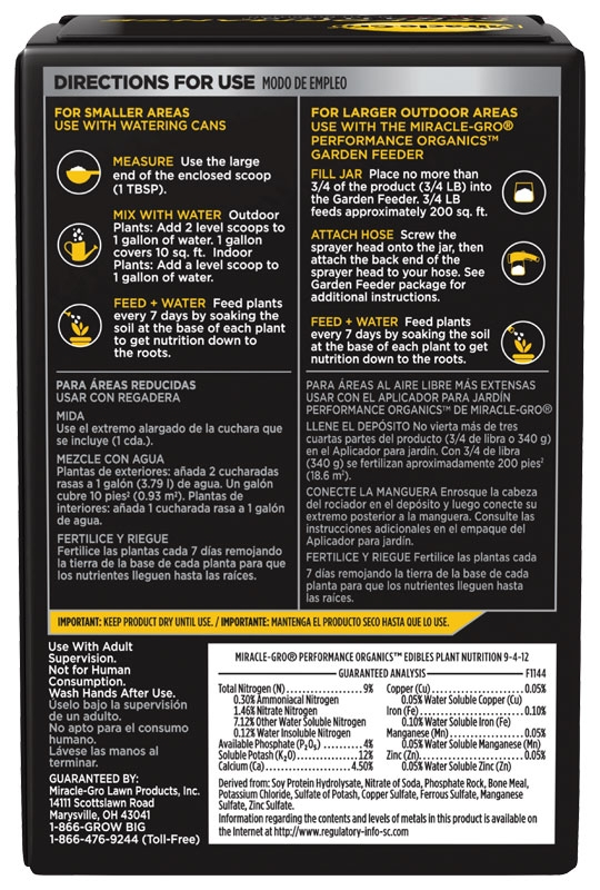The organic ingredients in Miracle-Gro Performance Organics Edibles Plant Nutrition is specifically formulated for growing tomatoes, vegetables, herbs, and fruits. This OMRI listed plant food instantly feeds edible plants in ground and in containers. Apply every 7 days using a watering can or a Miracle-Gro Performance Organics Garden Feeder. Enjoy a bountiful harvest this season when you feed your garden with the organic ingredients in Miracle-Gro Performance Organics Edibles Plant Nutrition.