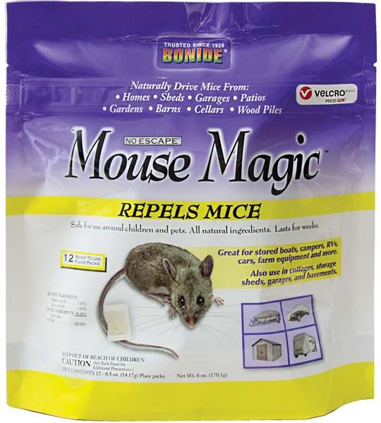 Watch’em disappear! Mouse Magic contains natural ingredients which triggers “escape/avoidance” behaviors in mice driving them from homes, sheds, patios—–. This unique new method of rodent control combines the effectiveness of essential oils with the convenience of “scent pack” technology. Simply locate “scent packs”, which exude the repelling quality of the essential oils, any where mice enter, feed or nest.
