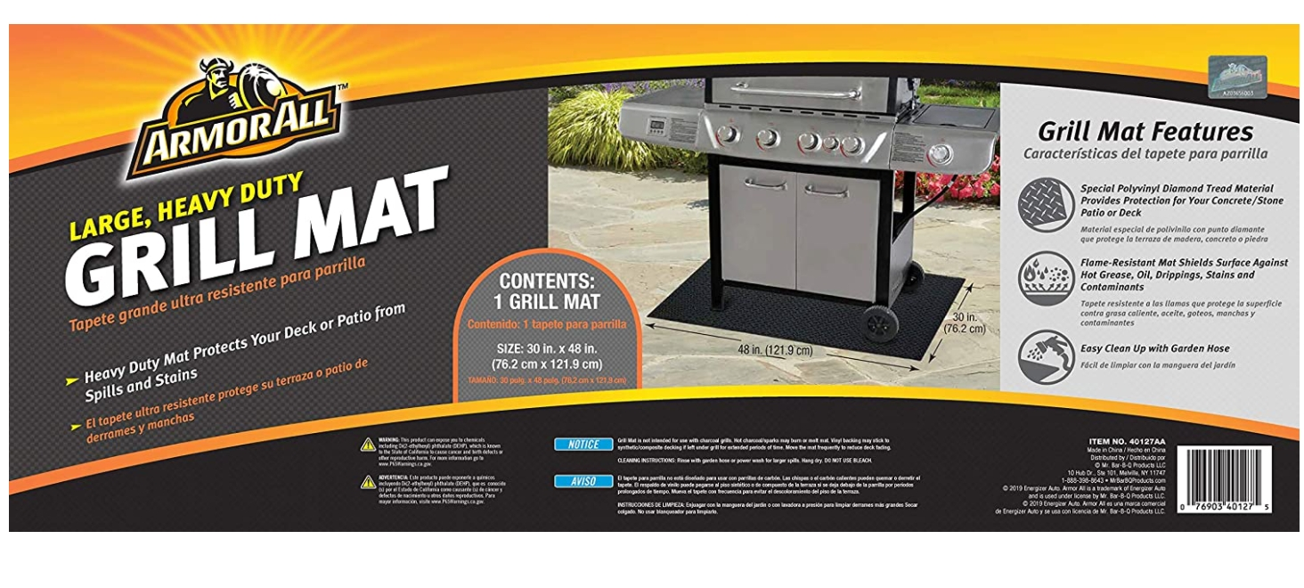 Protect your deck or patio the Armor All way. This large heavy duty grill mat has a special polyvinyl diamond tread material providing protection for your concrete stone patio or deck. If it gets dirty simply rinse it off with your garden hose and air dry.