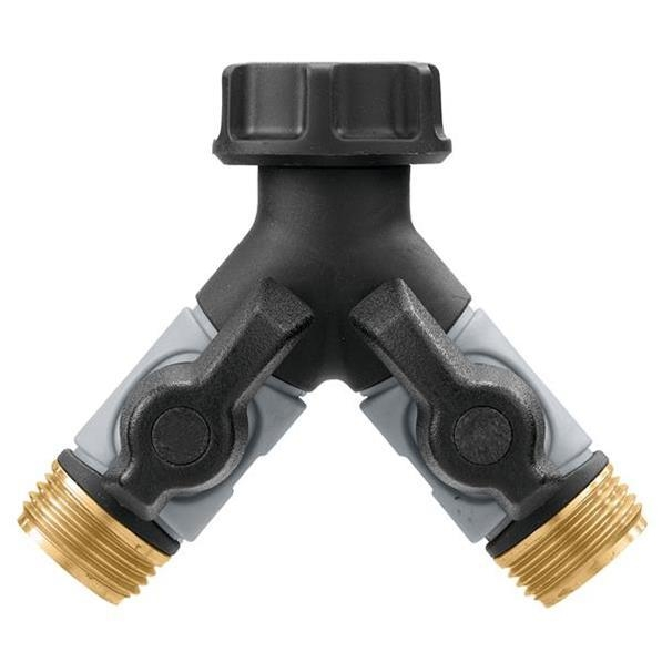 This hose Y converts one faucet into two, allowing you to use two hoses from the same faucet. Convenient valve controls let you adjust the flow or shut-off each connection. The 3/4″ male-threaded connection has a swivel head for easy installation. Heavy-duty metal construction with leak-free ball valve ensures quality performance.