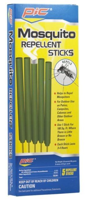Enjoy being outdoors again by eliminating the mosquitos in your backyard, patio or campsite. The Area Mosquito Repellent Sticks from Pic Corp last for 3 to 4 hours each and cover 100 ft! These fast-acting sticks are highly effective and will greatly improve your outdoor experience–no more swatting mosquitos off your arms or shooing them away from drs.