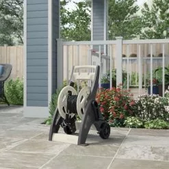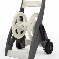 The Hosemobile® Hose Reel Cart by Suncast® holds up to 175 ft. of standard 5/8 in. hose. Our Slide Trak® technology assists in an even rewind and unwind, preventing the hose from building up on one side of the reel. The built-in wheels also make it easy to transport through your garden. This hose reel cart is constructed of durable weather-resistant resin material that is easy to maintain. Portable, functional and built to last, you can’t ask for much more in a hose reel storage solution.