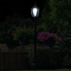 The 7′ tall ken wick solar lamp post features a switchable Amber & white LEDs. This classic design provides a sophisticated way to light your yd. Built-in planter & addition arm hooks for hanging additional plants allow you to celebrate your plants!