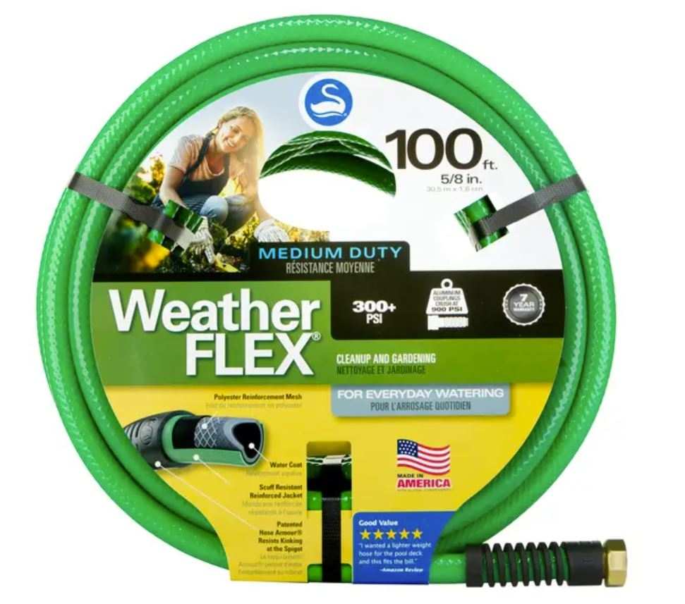 Swan’s WeatherFLEX 5/8″ x 100′ all-weather hose is a medium-duty garden hose perfect for everyday watering tasks such as watering the garden, watering the lawn and general cleanup. With a 5/8-inch inside diameter and strong 300+ PSI burst strength, the WeatherFLEX water hose delivers just the right amount of water at the right speed for all of your outdoor needs. This flexible garden hose also includes Swan’s patented Hose Armour at the female coupling to prevent it from kinking at the water source, while aircraft-grade-aluminum couplings are crush-resistant to 900 PSI. An easy-to-clean jacket, meanwhile, is abrasion-resistant to help keep the WeatherFLEX hose free from wear and tear.