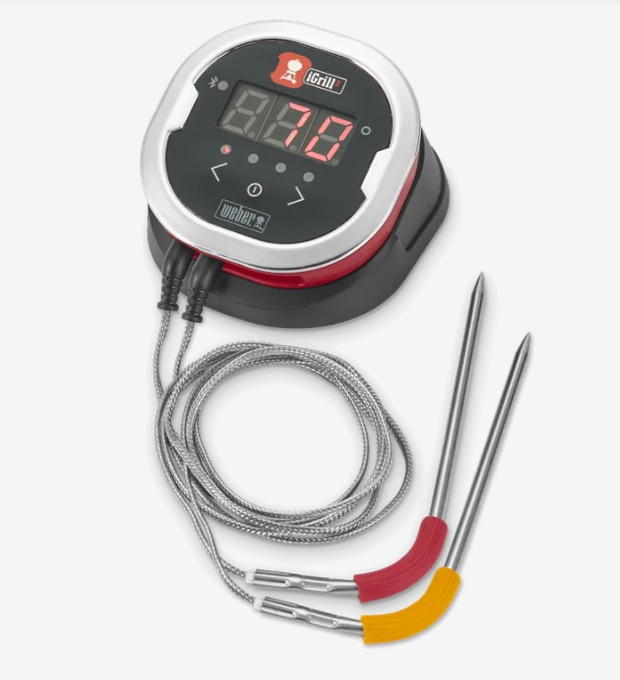 Take the guesswork out of grilling, and achieve your ideal doneness—without having to constantly check your meat. Use the the iGrill 2 digital thermometer to track up to four pieces of meat simultaneously while achieving pinpoint doneness levels on each. With 200 hours of battery life and a 45-metre line-of-sight wireless connection, this magnetic, grill-mountable thermometer includes two color-coded, professional-grade meat probes and has a maximum four-probe capacity. It seamlessly pairs with your mobile device via the Weber iGrill app to immediately alert you once your foods have reached their ideal doneness. The iGrill 2 also features an illuminated display with LED temperature readout, which means you’ll never have to lift the lid on your grill or smoker and interrupt the cooking process.Â
